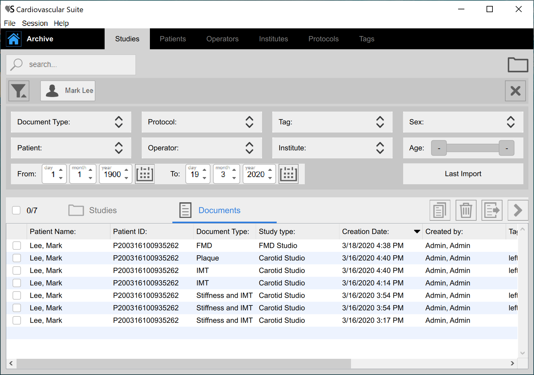 In addition, it is possible to filter the studies by patient, operator, and institute by going to their panels and double clicking on one of them.