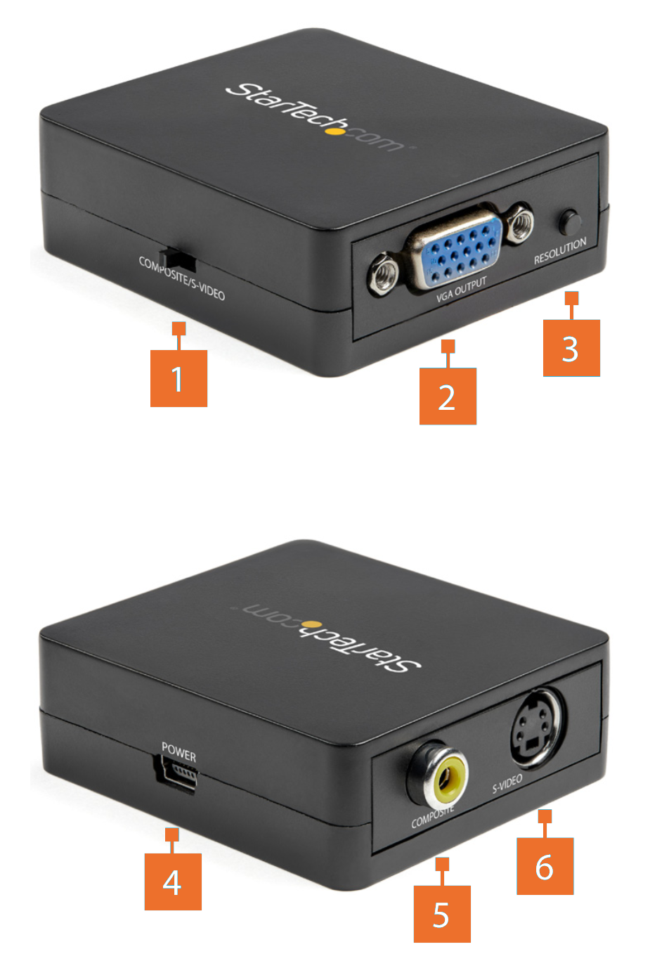- Connect a VGA Cable to the VGA Output Port on the Video Converter (2).