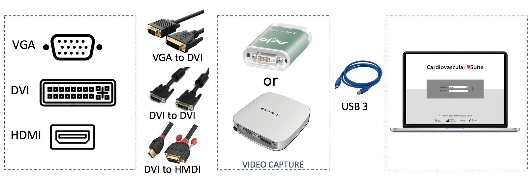 - VGA video output: use a VGA-to-DVI cable to connect your ultrasound machine to the Epiphan AV.io HD or the Magewell USB Capture AIO; then use the USB 3.0 cable to connect the video capture device to your computer.