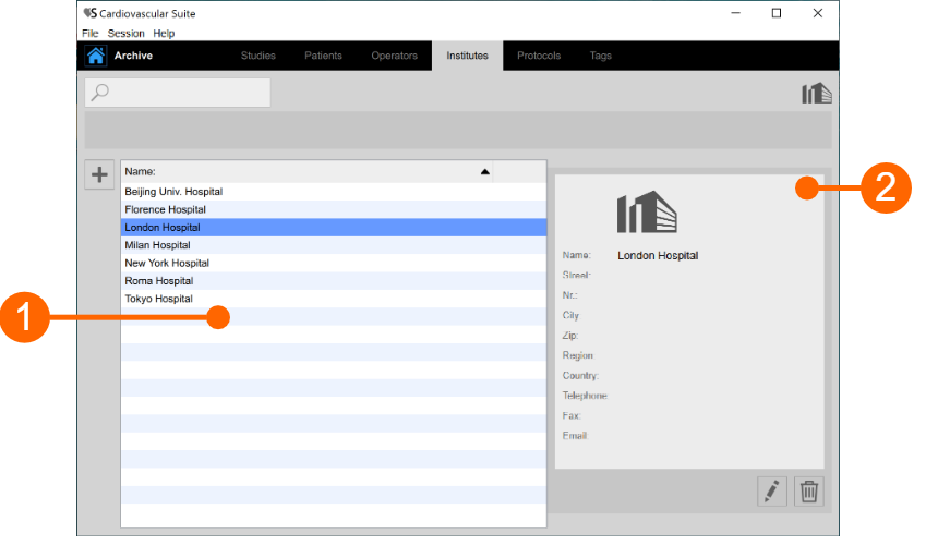 You can double click on the institute in table (1) to show the studies performed within this institute in the Studies management window.