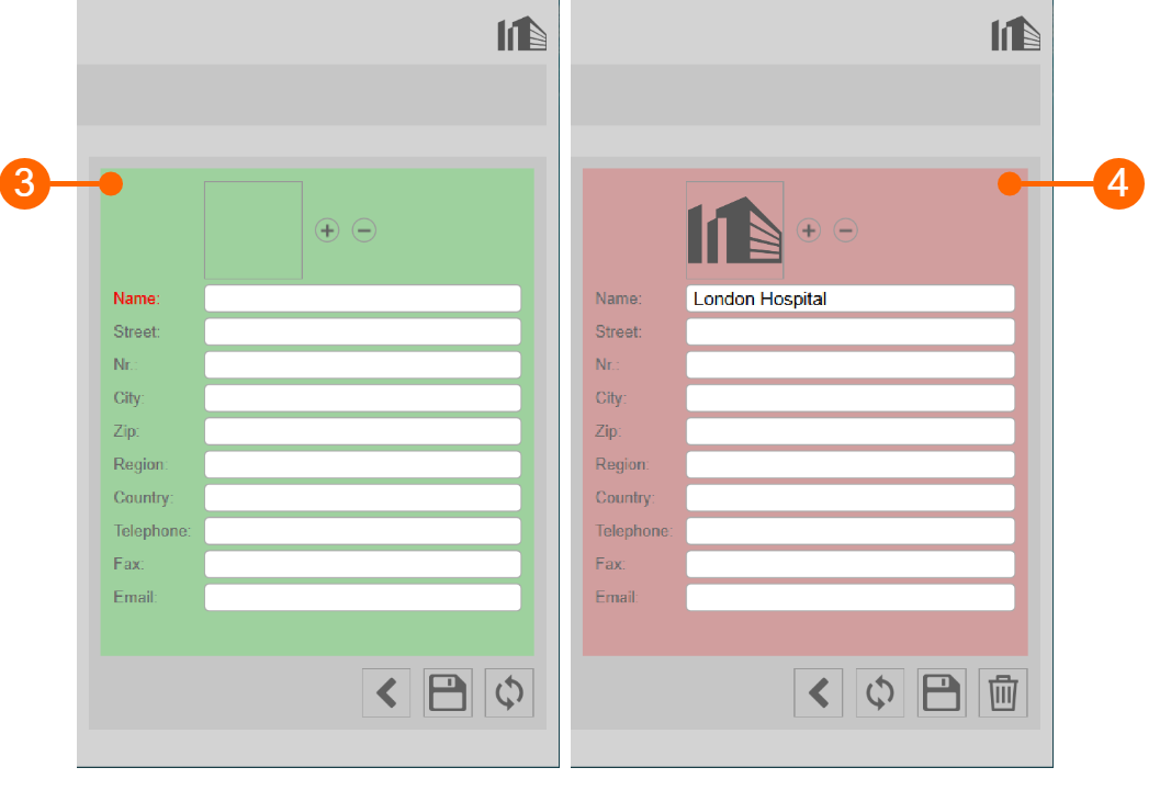 button for adding a new institute. - In the new institute frame (3), enter the institute data. The mandatory field (Name) is in red.